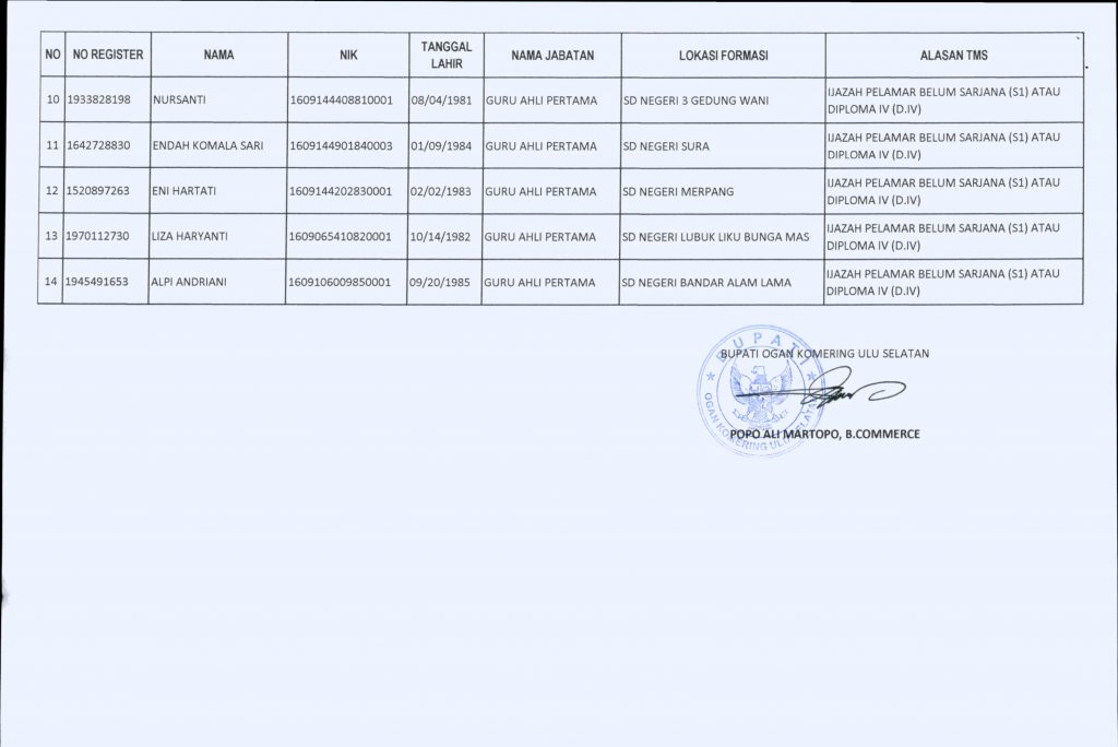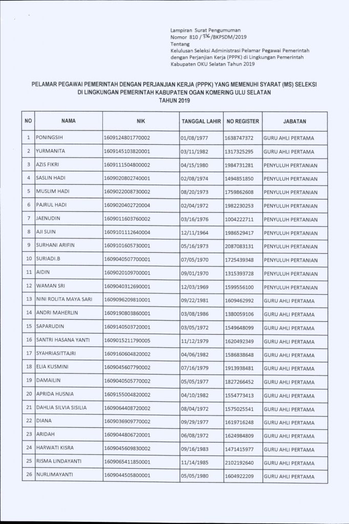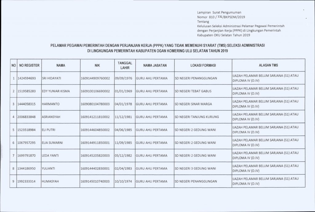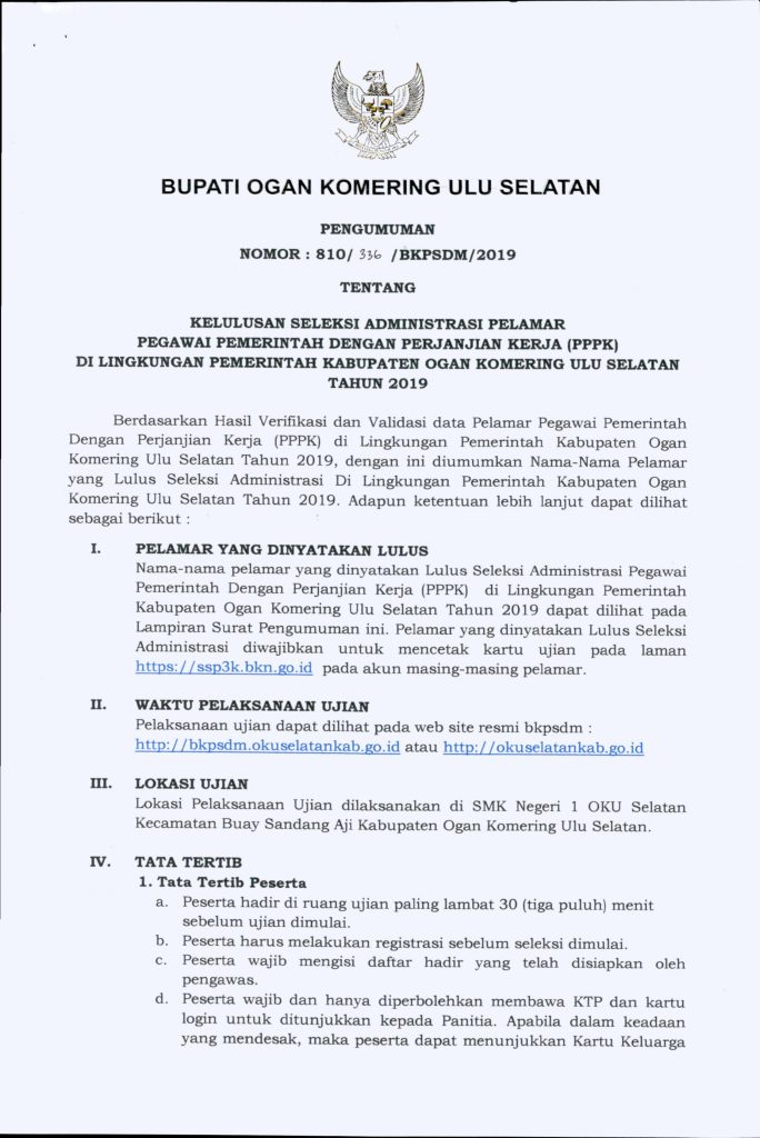 BERIKUT PENGUMUMAN KELULUSAN SELEKSI ADMINISTRASI PELAMAR PEGAWAI PEMERINTAH DENGAN PERJANJIAN KERJA (PPPK) DI LINGKUNGAN PEMERINTAH KABUPATEN OKU SELATAN TAHUN 2019