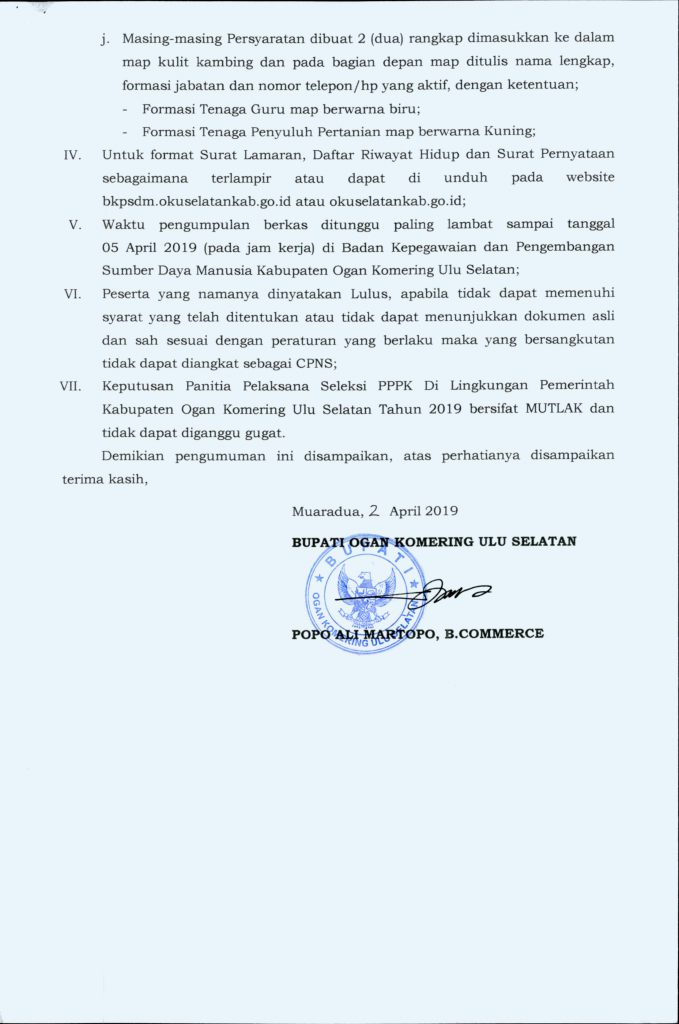 HASIL AKHIR SELEKSI PENGADAAN PEGAWAI PEMERINTAH DENGAN PERJANJIAN KERJA (PPPK) DI LINGKUNGAN PEMERINTAH KABUPATEN OGAN KOMERING ULU SELATAN TAHUN 2019