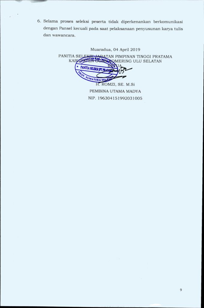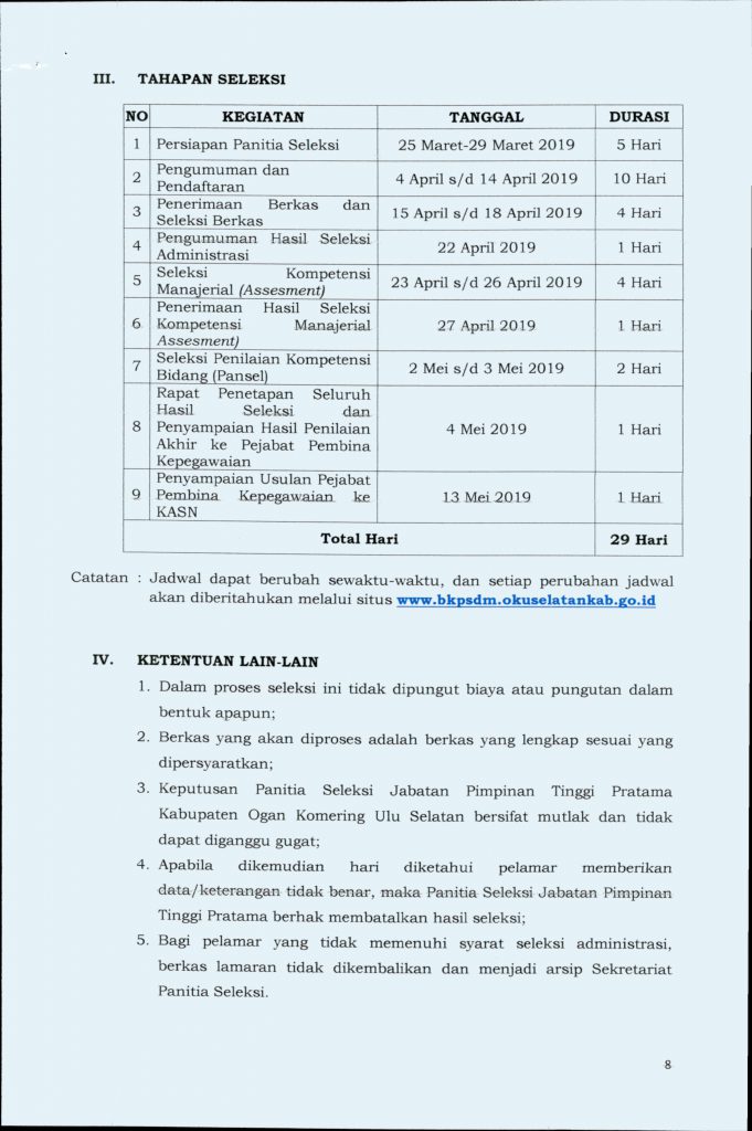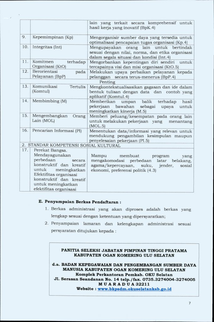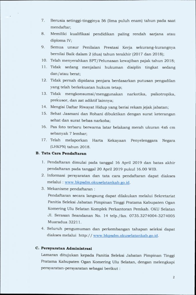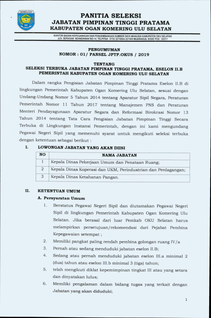 SELEKSI TERBUKA JABATAN PIMPINAN TINGGI PRATAMA, ESELON II.B PEMERINTAH- KABUP,ATEN-OGAN K0MERING ULU SELATAN