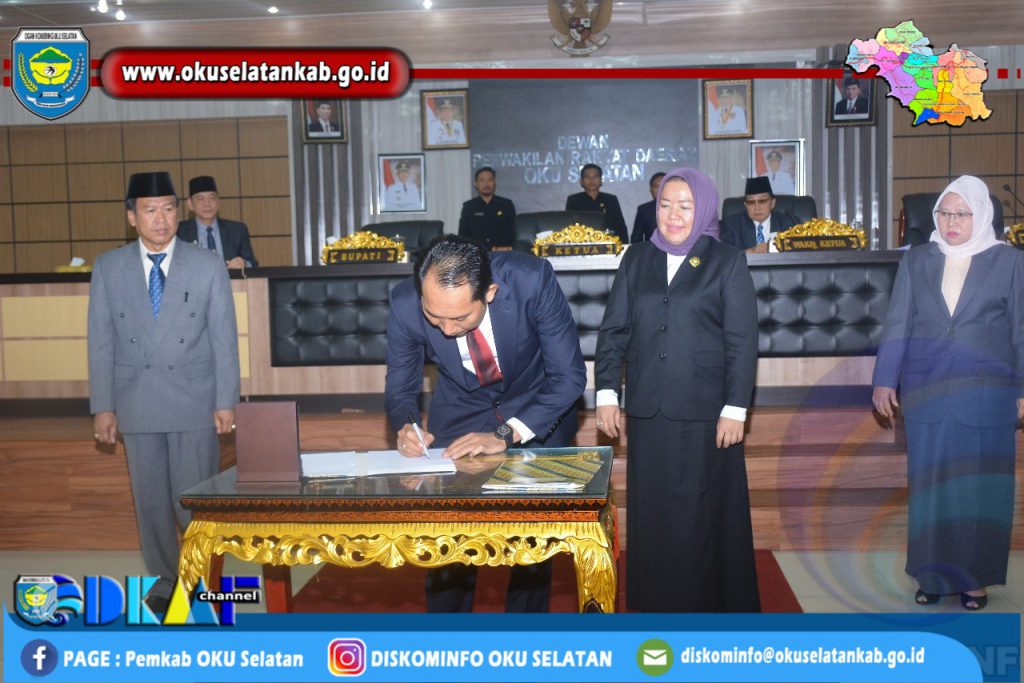 Setelah rancangan yang dibacakan Sekretaris DPRD diterima dan disetujui oleh seluruh Anggota DPRD OKU Selatan, dilanjutkan dengan Penandatanganan Berita Acara Persetujuan Bersama dan Surat Keputusan Bersama Kepala Daerah dan DPRD OKU Selatan. Dalam kesempatan ini Bupati OKU Selatan didampingi oleh Sekretaris Daerah dan Ketua DPRD OKU Selatan didampingi Sekretaris DPRD.
