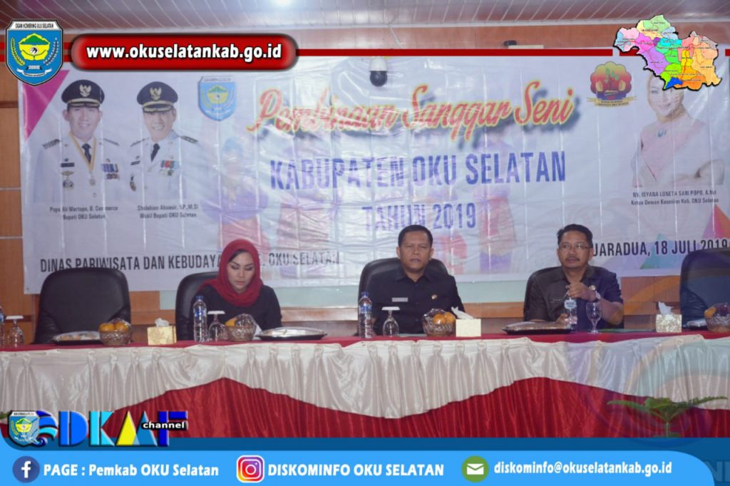 Bertempat di Aula Pemkab OKU Selatan, Pembinaan Sanggar Seni Kecamatan Kabupaten OKU Selatan ini, dihadiri oleh Asisten I Bidang Pemerintahan dan Kesejahteraan Rakyat Joni Rafles, AP.,M.Si, Ketua Dewan Kesenian Isyana Lonetasari Popo, Kepala OPD, Para Camat, dan anggota Sanggar Seni Kecamatan.