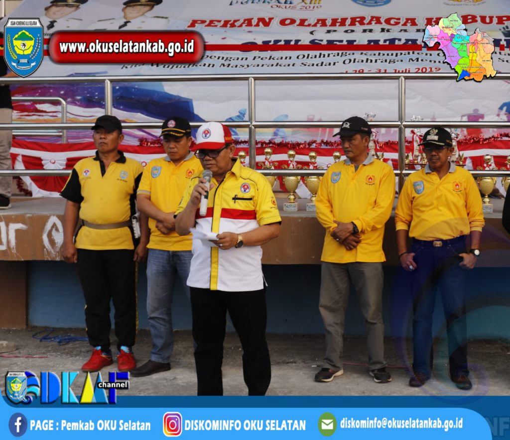 Dalam sambutannya Kepala Dispora mengucapkan selamat kepada pemenang dan berterima kasih kepada semua pihak yang telah mendukung terselenggaranya kegiatan ini, sehingga berlangsung dengan sukses.”Saya atas nama Pemerintah Kabupaten OKU Selatan, memberikan penghargaan yang tinggi dan ucapan terimakasih kepada jajaran KONI OKU Selatan yang telah bekerja sangat keras dan penuh dedikasi. Dalam mempersiapkan dan mengelola pelaksanaan PORKAB ke-XIII tahun 2019. Saya juga berterima kasih kepada para atlit yang sudah berpartisipasi dalam kegiatan ini, tanpa para atlit PORKAB ini jauh dari kata sempurna,”ujar Kadispora.