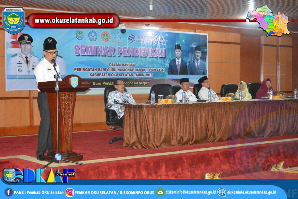 ASISTEN I BIDANG PEMERINTAHAN DAN KESRA BUKA KEGIATAN SEMINAR PENDIDIKAN DALAM RANGKA HGN DAN HUT KE-74 PGRI,  SEBANYAK 150 ORANG GURU SE-KABUPATEN OKU SELATAN IKUTI SEMINAR