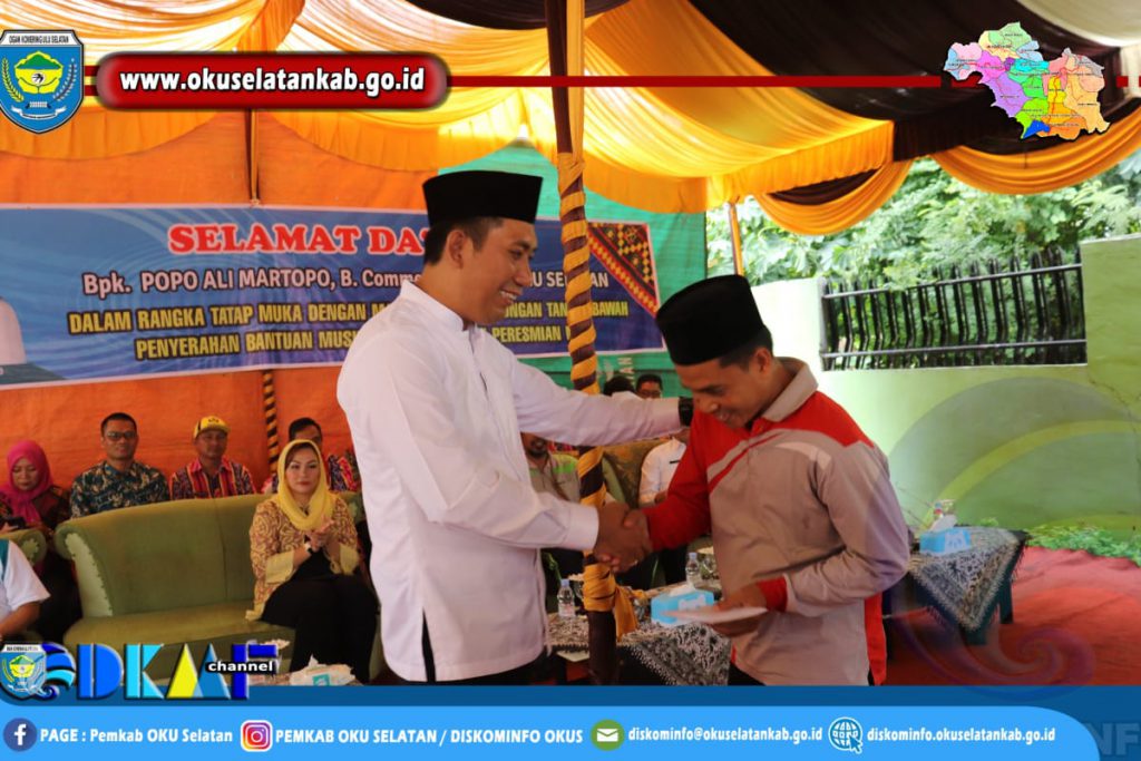 Muaradua (24/01) Bupati OKU Selatan Popo Ali M.,B.Com. hadir langsung di tengah masyarakat Linkungan Tangsi Bawah Kelurahan Bumi Agung Kecamatan Muaradua, dalam rangka tatap muka bersama masyarakat untuk meresmikan MCK (Mandi Cuci Kakus), sekaligus memberikan bantuan uang tunai kepada pengurus Mushollah Muslim, Jumat (24/01/2020).