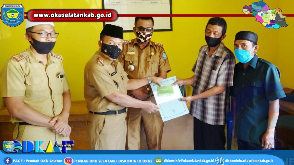 Mewakili Bupati OKU Selatan Popo Ali M.,B.Com. Kepala Bagian Kesra Setda OKU Selatan Taslim, S.E.,M.M. serahkan langsung Dana Hibah Pembangunan Masjid Kepada Ketua Pembangunan masjid, yang turut disaksikan oleh Camat BSA Yamin, S.Sos.,M.M.