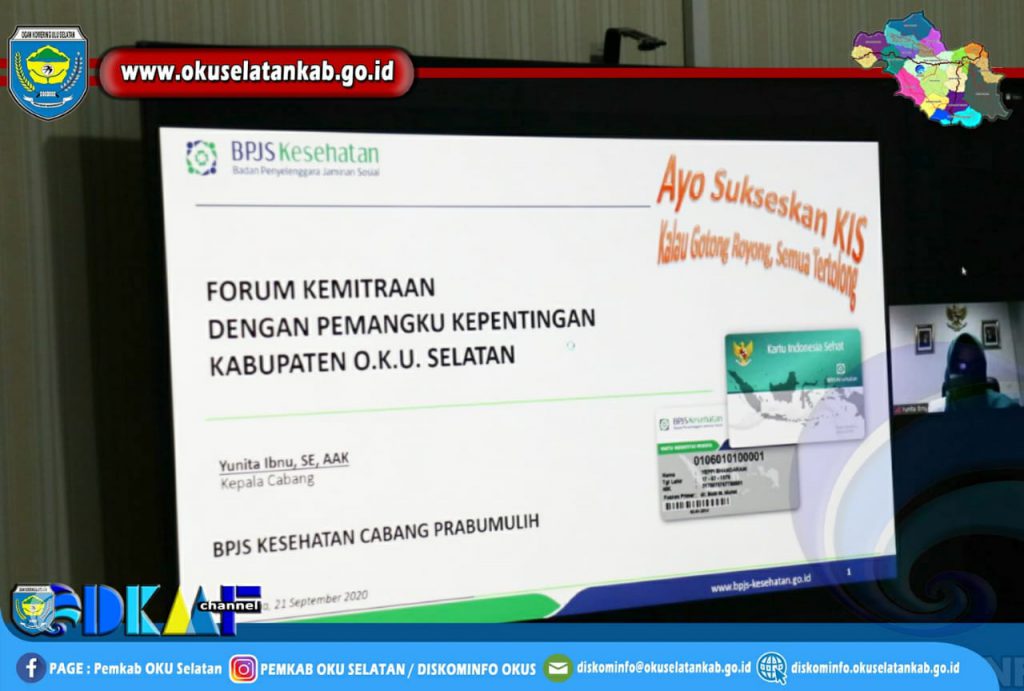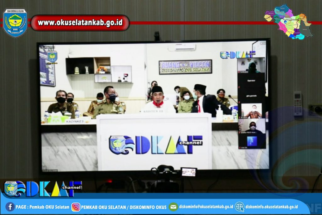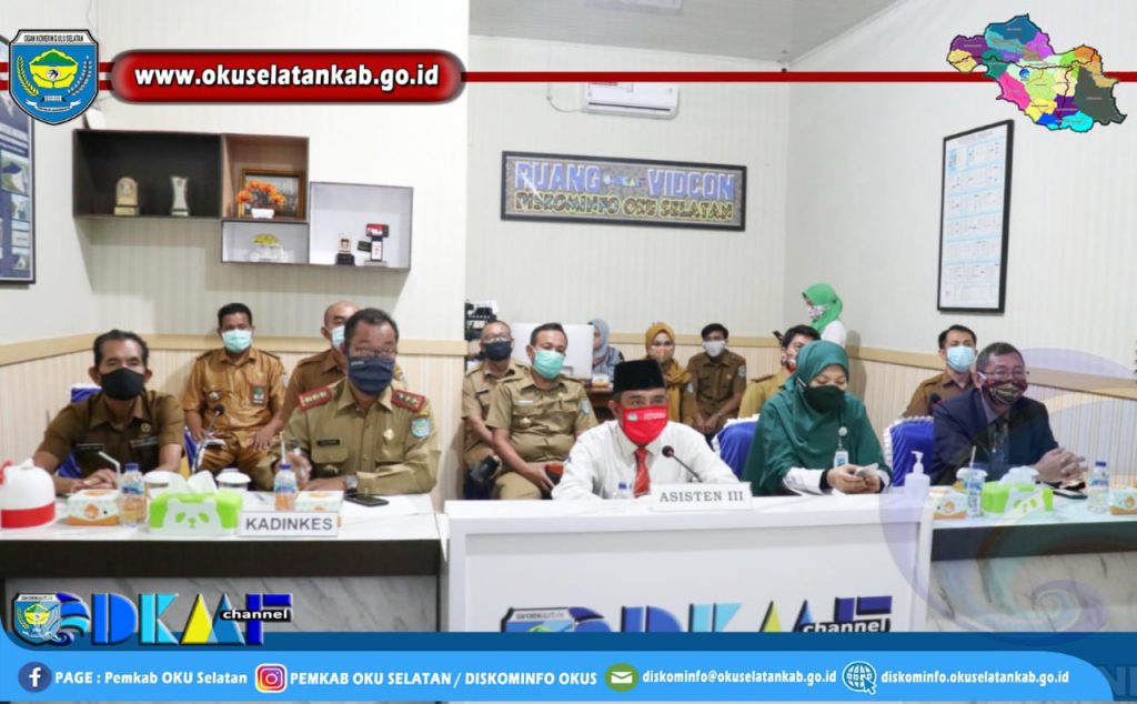 Muaradua (21/09) Mewakili Bupati OKU Selatan Popo Ali M.,B.Com. Asisten III Bidang Administrasi Umum Setda OKU Selatan Drs. H. Herman Azedi, SKM.,M.M. ikuti Video Conference dalam rangka Forum Gabungan Kemitraan dan Komunikasi dengan Kepentingan Kabupaten yang digelar BPJS Kesehatan Perwakilan OKU Selatan, di Ruang Vidcon Dinas Komunikasi dan Informatika Kabupaten OKU Selatan, Senin (21/09/2020).
