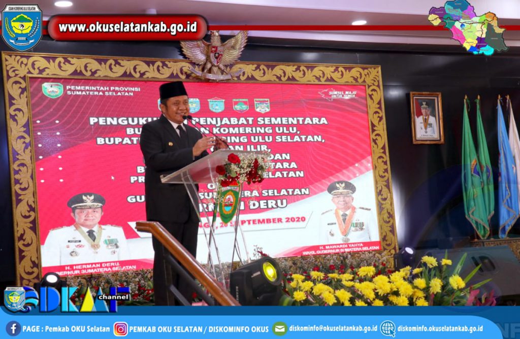 Palembang (26/09) Gubernur Sumatera Selatan H. Herman Deru melantik Lima Pejabat Pratama Tinggi Pemerintah Provinsi Sumsel, menjadi Penjabat Sementara (Pjs) Bupati yang kepala daerahnya mengajukan cuti kampanye Pilkada, yakni Lima Kabupaten di Provinsi Sumatera Selatan, diantaranya Bupati Ogan Komering Ulu, Bupati Ogan Komering Ulu Selatan, Bupati Ogan Ilir, Bupati Musi Rawas, dan Bupati Musi Rawas Utara, di Griya Agung, Sabtu malam (26/09/2020).