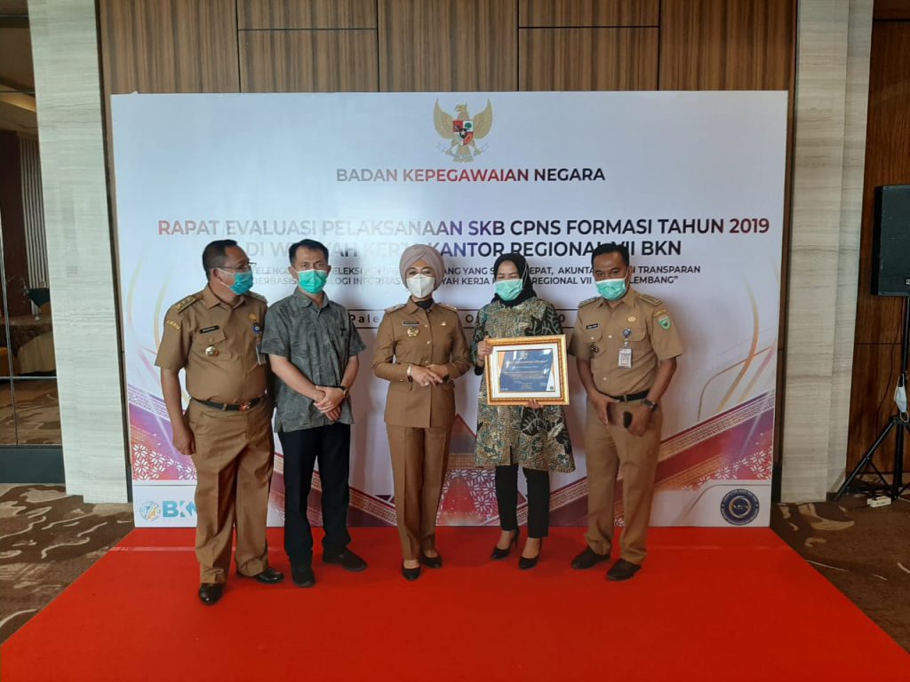 Pjs. Bupati OKU Selatan menerima langsung Penghargaan dari Badan Kepegawaian Negara (BKN) terkait Pelaksanaan Seleksi Kompetensi Bidang (SKB) Pengadaan Calon Pegawai Negeri Sipil (CPNS) formasi tahun 2019 yang sehat, cepat, akuntabel dan transparan berbasis teknologi informasi di wilayah kerja kantor regional VII.