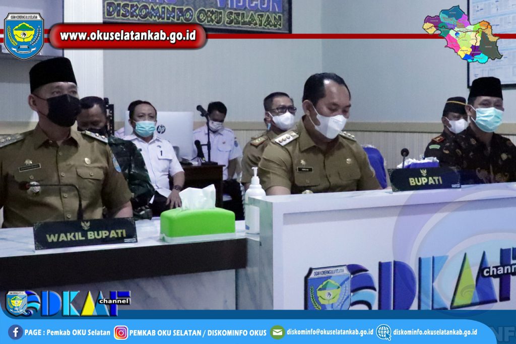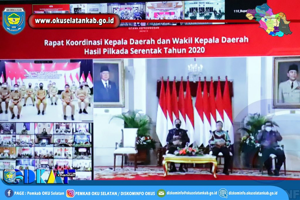 MUARADUA – Bupati Ogan Komering Ulu Selatan (OKUS), Popo Ali Martopo, B.Com., didampingi Wakil Bupati OKU Selatan, Sholehien Abuasir, S.P., M.Si, bersama Forkompinda dan perwakilan DPRD Kabupaten OKU Selatan mengikuti Rapat Koordinasi Kepala Daerah Hasil Pilkada Serentak 2020 yang dipimpin oleh Presiden Joko Widodo secara virtual di Ruang Vidcon Diskominfo OKU Selatan, Rabu (14/04) siang.
