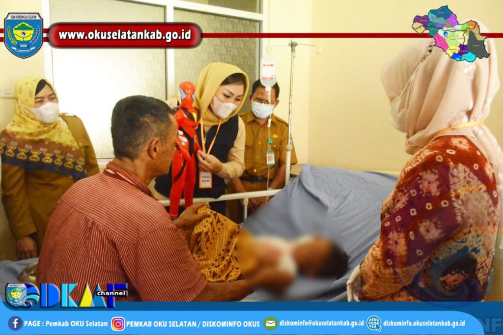 MUARADUA – Ketua Tim Penggerak PKK Kabupaten OKU Selatan, Isyana Lonitasari Popo bersama Wakil Ketua TP PKK OKU Selatan,Rosita Devi Sholehien menyantuni bocah yang mengalami luka bakar, Erwin (3) warga Desa Tanjung Durian, Kecamatan Buay Pemaca, Kabupaten OKU Selatan yang kini tengah di rawat di RSUD Muaradua, Senin (26/04) siang.