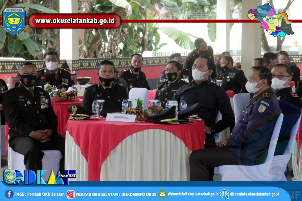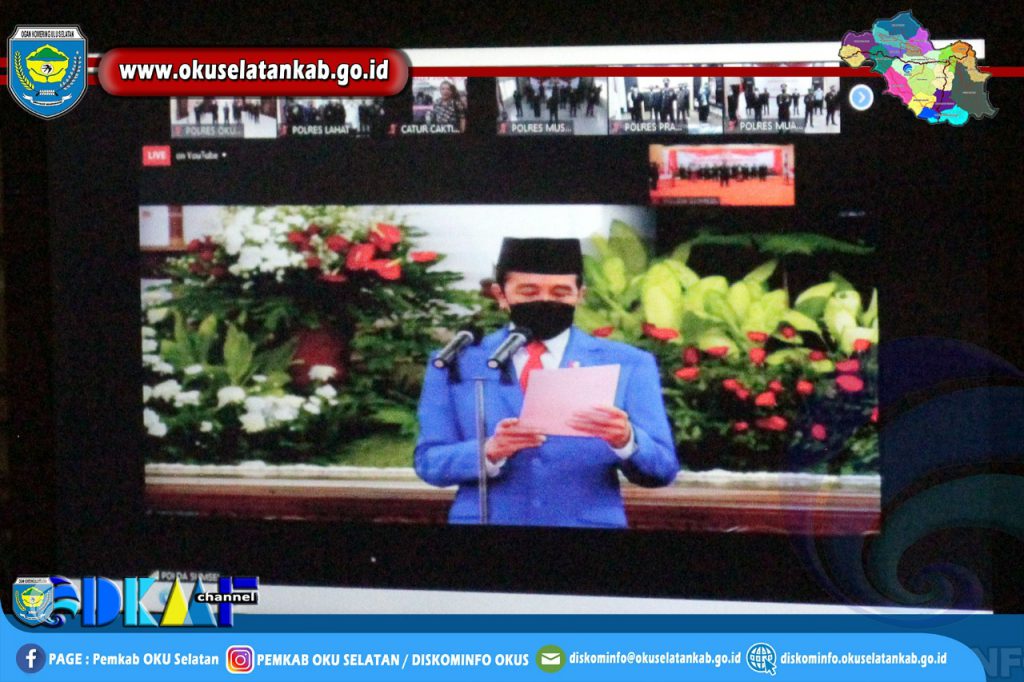 MUARADUA – Bupati Ogan Komering Ulu Selatan (OKUS), Popo Ali Martopo, B.Com., menghadiri puncak peringatan Hari Ulang Tahun (HUT) Bhayangkara ke-75 yang dilaksanakan secara virtual di Mapolres OKU Selatan bersama Kapolres OKU Selatan, Kajari OKU Selatan, Kalapas Muaradua dan Pabung Kodim 0403/OKU, Kamis (01/07/2021).