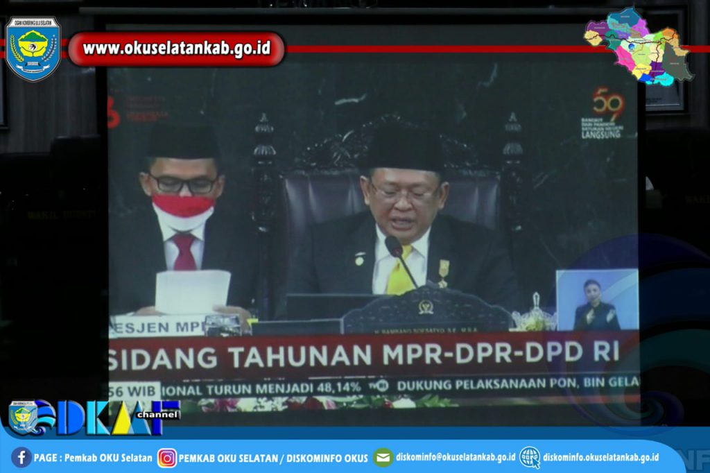 Muaradua (16/08) Wakil Bupati OKU Selatan Sholehien Abuasir,SP.,M.Si. hadiri Pidato Presiden RI Pada Sidang Tahunan MPR RI dan Sidang Bersama DPR-RI Tahun 2021 serta Pidato DPR RI dalam rangka Penyampaian RUU APBN Tahun Anggaran 2022 dan Nota Keuangan beserta Dokumen Pendukungnya Pada Rapat Paripurna Pembukaan Masa Persidangan I DPR-RI Tahun Sidang 2021-2022 secara Virtual, Senin (16/08/2021).