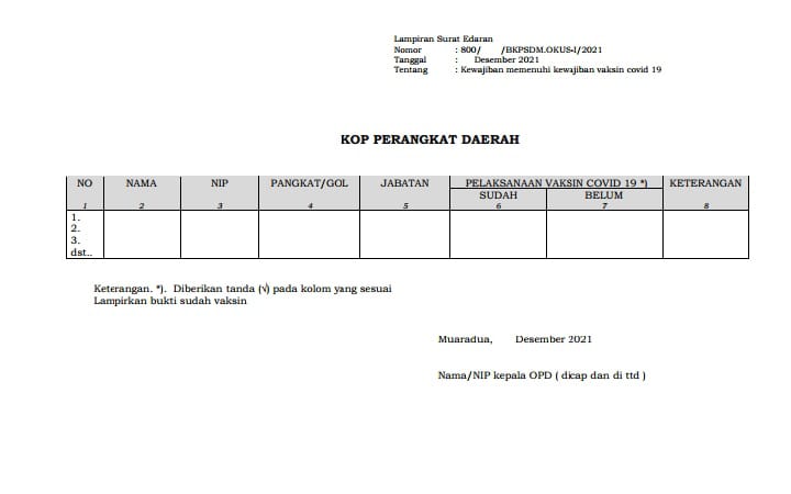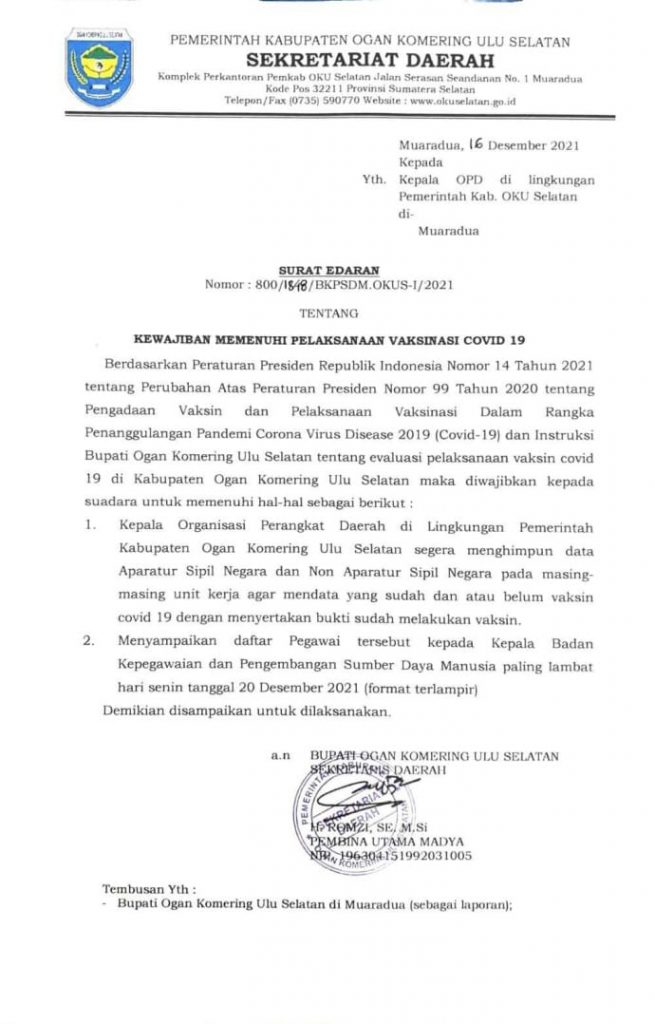 Dalam surat edaran tersebut menyebutkan dua poin penting, diantaranya yaitu agar Kepala OPD di linkungan Pemkab OKU Selatan segera menghimpun data ASN dan Non ASN pada masing-masing unit kerja agarmendata yang sudah atau belum vaksin COVID-19dengan menyertakan bukti sudah melakukan vaksin.