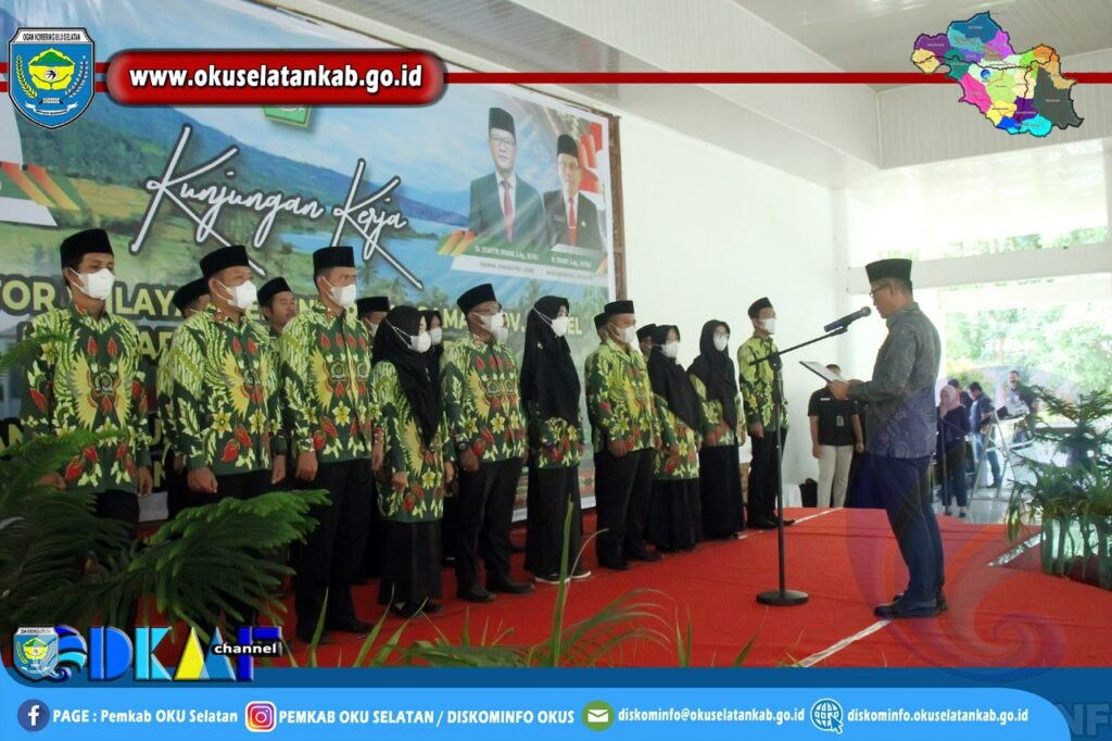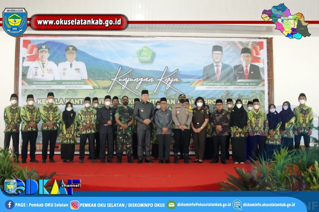 MUARADUA – Bupati Ogan Komering Ulu Selatan (OKUS), Popo Ali Martopo, B.Com., dan Wakil Bupati Ogan Komering Ulu Selatan (OKUS), Sholehien Abuasir, S.P., M.Si., menerima langsung Kunjungan Kerja Kepala Kantor Wilayah Kementerian Agama (Kemenag) Provinsi Sumatera Selatan (Sumsel) yang juga mengukuhkan Penggerak Moderasi Beragama Kantor Kementerian Agama Kabupaten Ogan Komering Ulu Selatan (OKUS), Selasa (12/07/2022).