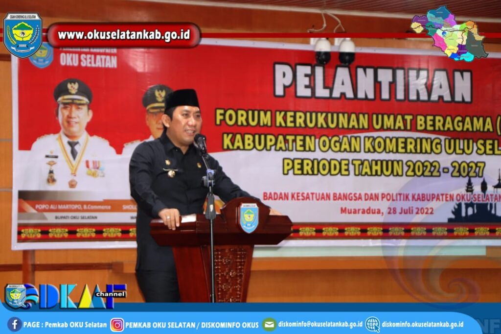 MUARADUA – Bupati Ogan Komering Ulu Selatan (OKUS), Popo Ali Martopo, B.Com., melantik Kepengurusan Forum Kerukunan Umat Beragama (FKUB) Kabupaten OKU Selatan Periode 2022-2027 di Aula Pemkab OKU Selatan, Kamis (27/08/2022) pagi. Tak hanya melantik, Bupati Popo Ali juga sekaligus membuka Rapat Koordinasi FKUB Kabupaten OKU Selatan Tahun 2022.