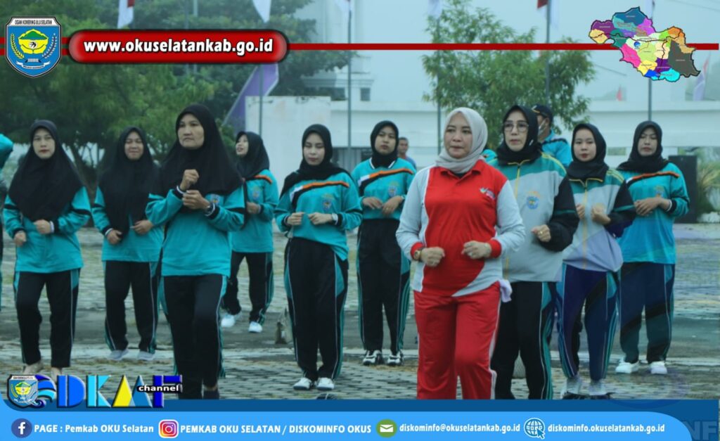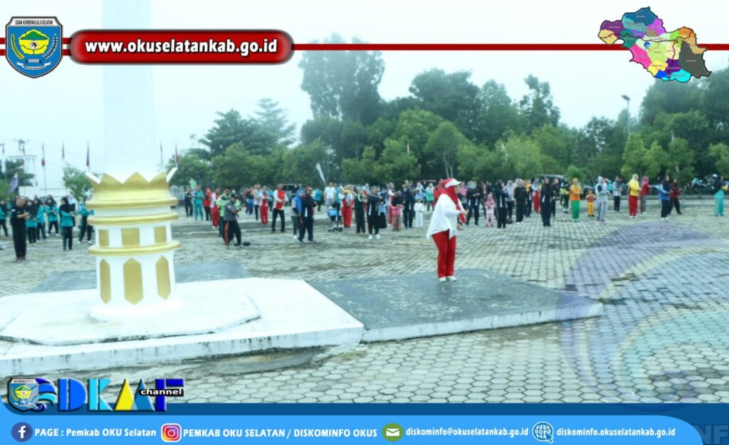 Senam sehat Bersama yang digelar di Lapangan Kantor Bupati OKU Selatan tampak diikuti dengan antusias oleh para peserta senam.