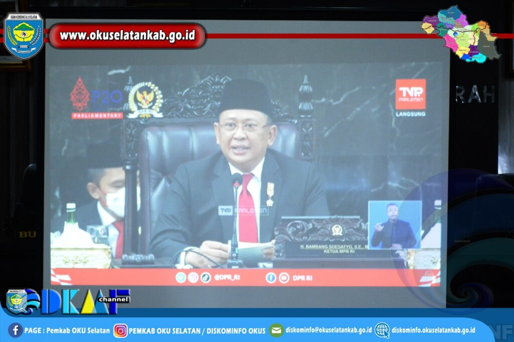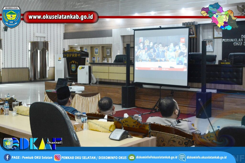 MUARADUA – Wakil Bupati Ogan Komering Ulu Selatan (OKUS), Sholehien Abuasir, S.P., M.Si., mendengarkan Pidato Kenegaraan Presiden Republik Indonesia dalam rangka Peringatan HUT Ke-77, Kemerdekaan Republik Indonesia Tahun 2022 via live streaming, selasa (16/08/2022), di Gedung DPRD Kabupaten OKU Selatan.