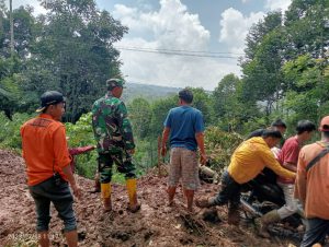 MUARADUA – Personel Badan Penanggulangan Bencana Daerah (BPBD) Kabupaten Ogan Komering Ulu (OKU) Selatan membersihkan tanah material longsor akibat hujan deras yang terjadi pada hari Senin kemarin yang menutupi jalan di Desa Kemu Ulu, Kecamatan Pulau beringin OKU Selatan, Selasa (18/07/2023).