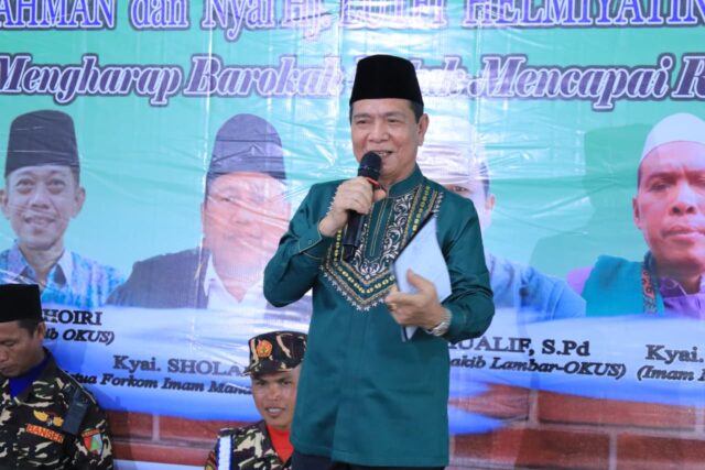 BANDING AGUNG – Wakil Bupati Ogan Komering Ulu (OKU) Selatan, Drs. H. Misnadi, M.M., M.Si., menghadiri kegiatan Pengajian Akbar Dzikir Manaqib Syaikh Abdul Qodir Aljailaniy ke-IV wilayah Lampung Barat dan OKU Selatan yang dirangkaikan dengan Halal Bihalal serta Haul Syaikh Abdul Qodir Aljailaniy. Kegiatan ini berlangsung di Masjid Daruth Tho’ah, Desa Sipatuhu, Kecamatan Banding Agung, Kabupaten OKU Selatan, Sabtu (11/04/2026).